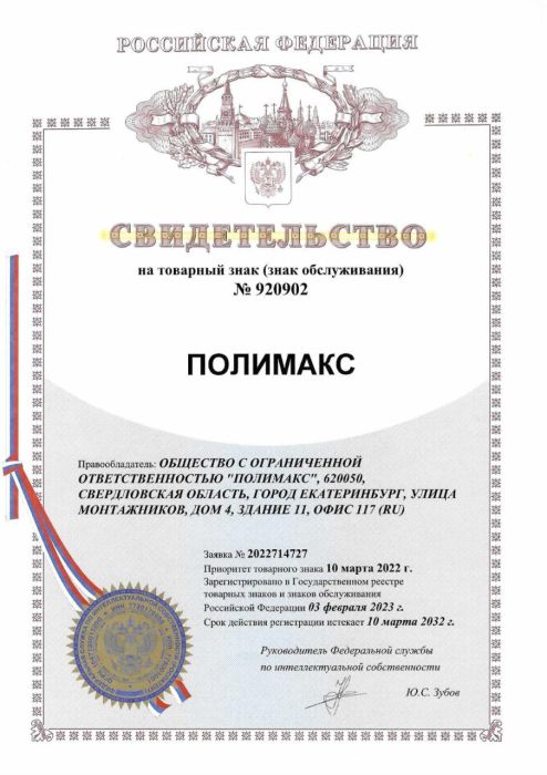 Товарный знак «Полимакс» зарегистрирован в соответствующем государственном реестре. Срок регистрации составляет 10 лет, до марта 2032 года.