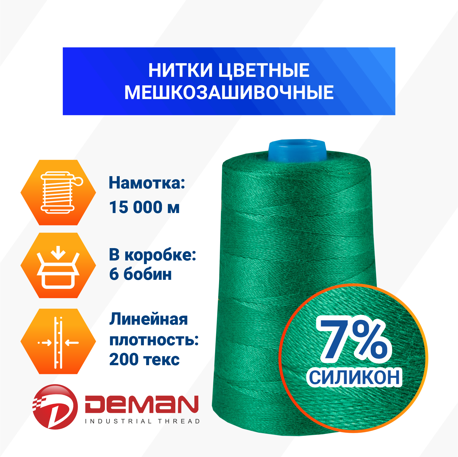 Линейная плотность — 200 текс, длина — 15 000 м.